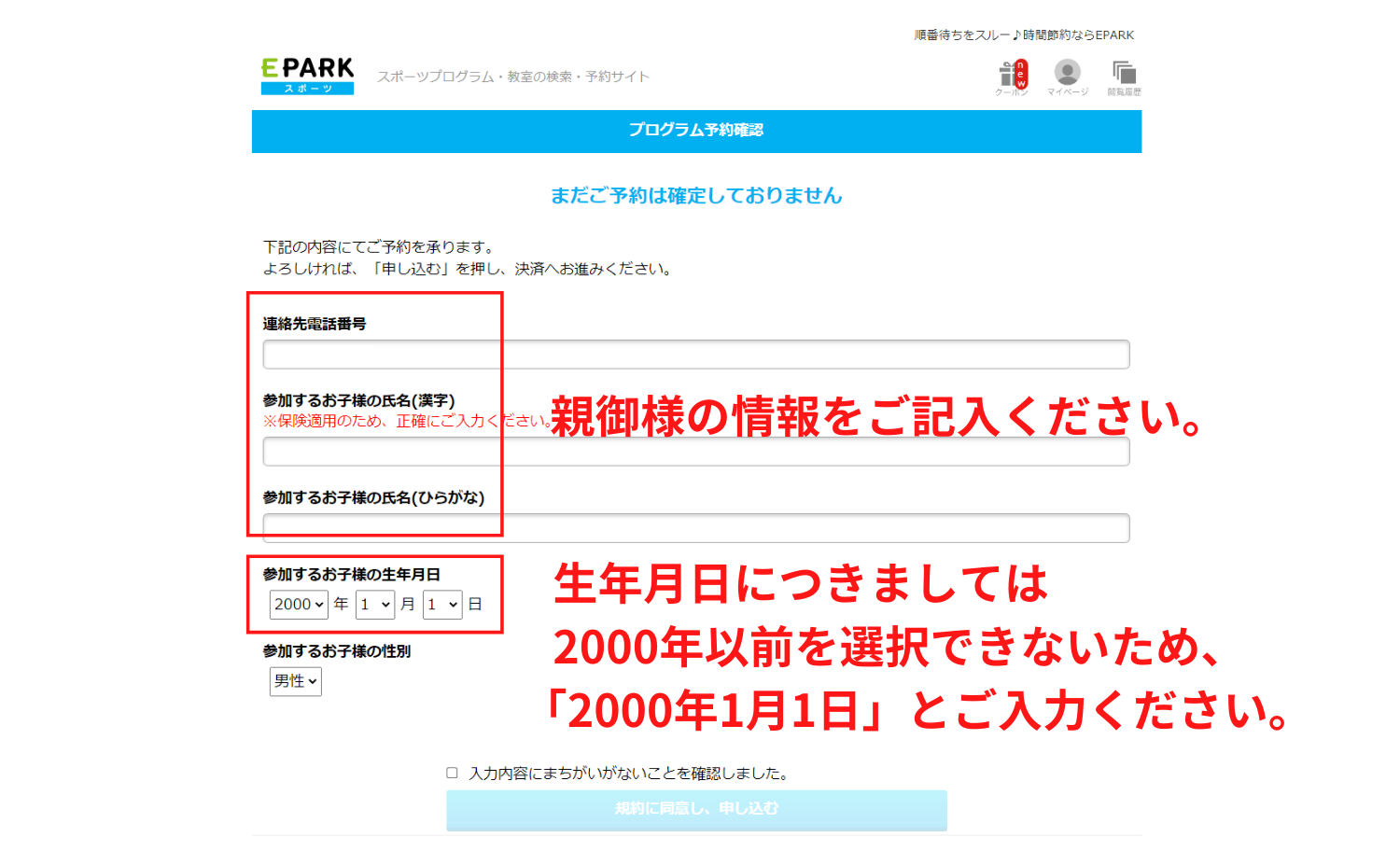 親御様のご予約の際に「参加するお子様の●●」と表示される入力欄には、参加される親御様ご自身の情報をごご入力ください。予約システムの仕様の関係で生年月日につきましては、「2000年1月1日」とご入力ください。